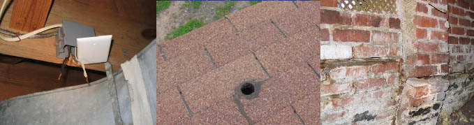 Cracked and blistering shingles allowing leaks visible inside the attic